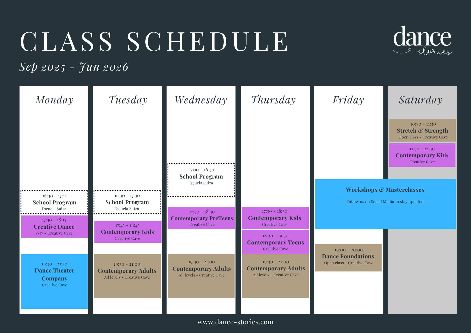 The Dance Stories program offers dance classes for all ages and levels, in person in the dance studio and online via Zoom. You can put together your individual schedule from a variety of courses such as Contemporary Dance, Creative Kids Dance, Dance Fitness, Dance Company Training, and more!